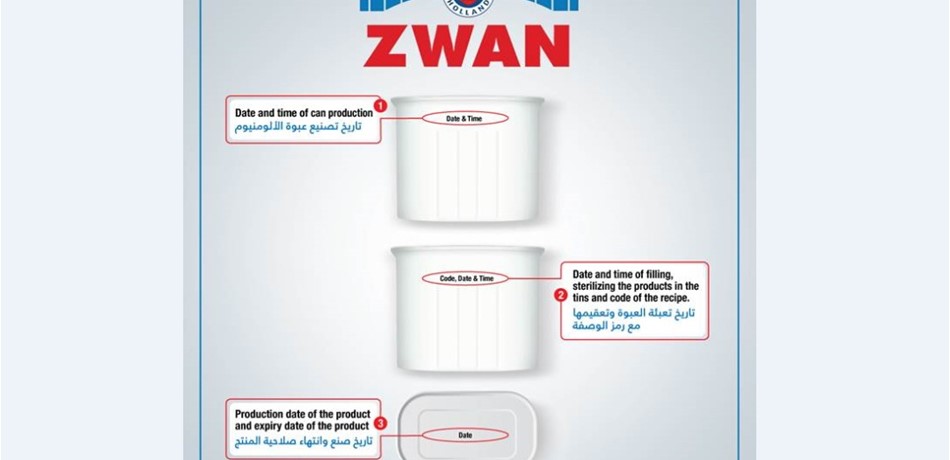 وأوضحت الشركة أنّ "التاريخَيْن هما: تاريخ تصنيع العبوة وتاريخ تعبئة العبوة وتعقيمها مع رمز الوصفة"، لافتة إلى أنّ "هذه الإجراءات الإضافية تتّخذ للمزيد من الوقاية في عملية تعقّب الشركة لعبواتها، وما هي إلّا ترسيخ حرص الشركة على المحافظة على جودة منتجات "Zwan"، فخر صناعتها التي تعتمد على أعلى معايير الجودة العالمية لسلامة الغذاء منذ أكثر من 100 سنة".