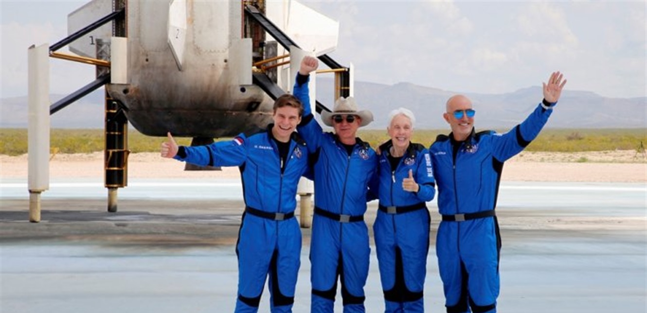 وسافر طالب فيزياء هولندي اسمه أوليفر دايمن (18 عاما)، رفقة جيف بيزوس وشقيقه مارك بيزوس، والطيارة والي فانك (82 عاما)، إلى حافة الفضاء، في رحلة استغرقت 11 دقيقة، بمسافة تزيد على 60 ميلا فوق سطح الأرض.
