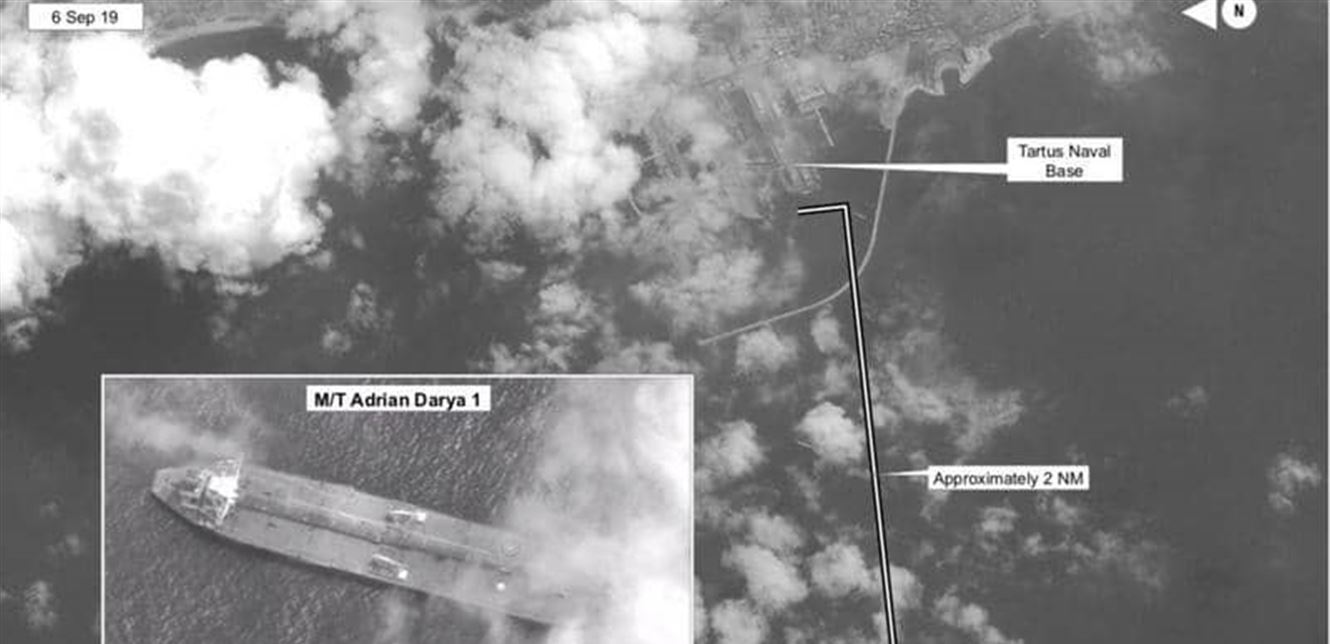 وأرفق بولتون تغريدته بصورة ملتقطة من الأقمار الصناعية، بتاريخ 6 أيلول 2019، تظهر ناقلة النفط الإيرانية أدريان داريا 1 قبالة القاعدة البحرية في طرطوس.