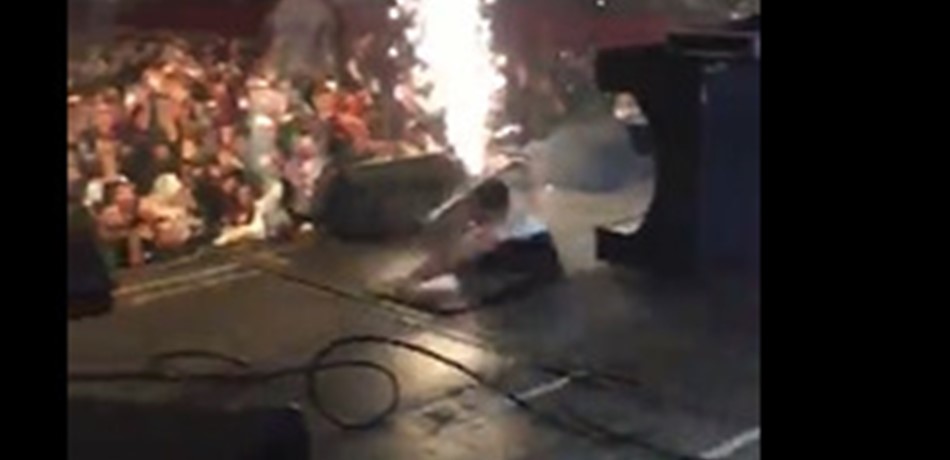 وفي الفيديو يظهر الفنان وهو يرقص على وقع اغنتيه ويقفز متنقلاً على المسرح الذي يبدو أن بعض اللوحات الخشبية غير مثبتة بشكل محكم عليه، ليسقط رعد تحت المسرح بعد تحطم احدى الالواح، ويسارع الفريق المختص لانقاذه.