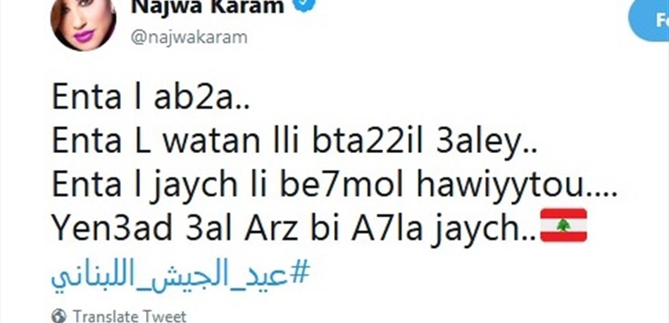 بدورها كتبت نجوى كرم: "انت الباقي، انت الوطن اللي بتقل علي، انت الجيش اللي بحمل هويتو.. ينعاد عالأرز بأحلى جيش".