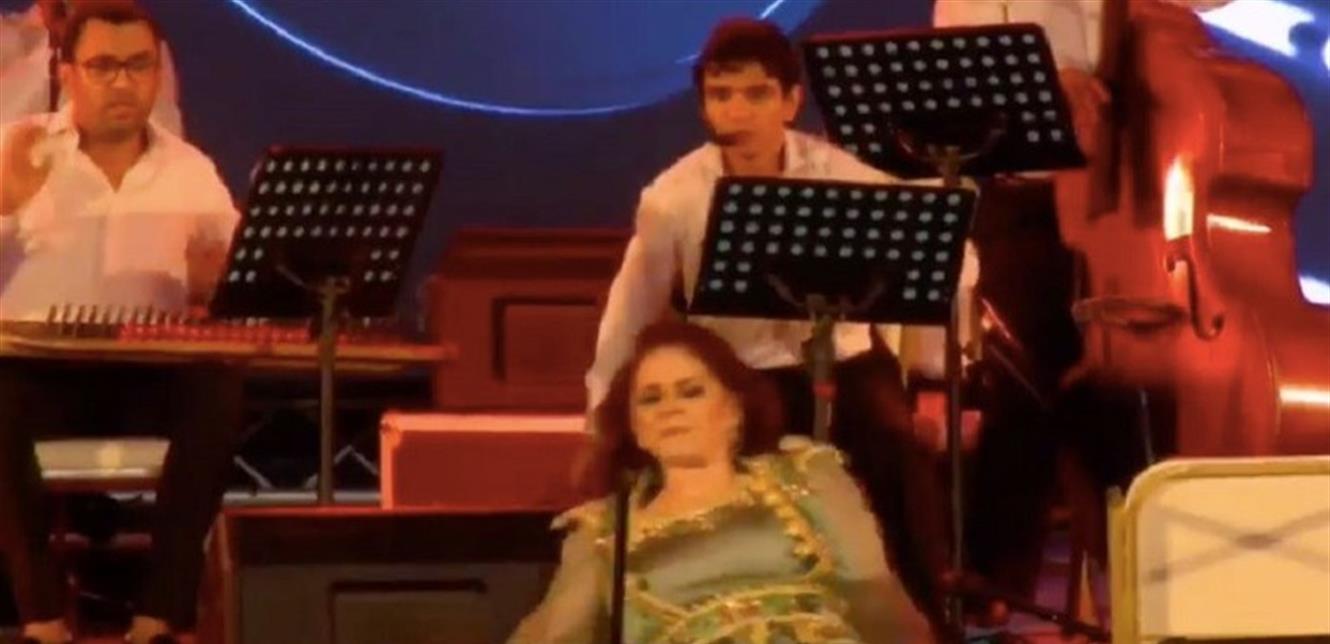 وحدث ذلك أثناء أدائها لأغنية "أنا بعشقك"، ليسارع قائد الفرقة الموسيقية المايسترو، محمد لسود، إلى نجدتها ثم تدخل بعض المرافقين لمساعدتها على النهوض.