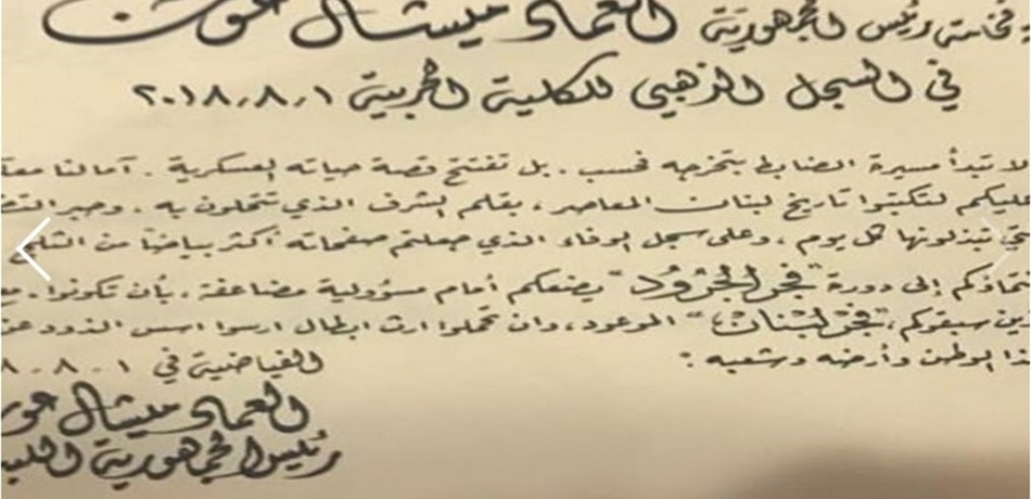 في احتفال تقليد السيوف للضباط المتخرجين من دورة "فجر الجرود" والذي تزامن مع العيد الثالث والسبعين للجيش، في الكلية الحربية، كتب الرئيس ميشال عون في السجل الذهبي للكلية الحربية: "لا تبدأ مسيرة الضابط بتخرجه، بل تفتح قصة حياته العسكرية. آمالنا معلقة عليكم لتكتبوا تاريخ لبنان المعاصر، بقلم الشرف الذي تتحلون به، وحبر التضحية التي تبذلونها كل يوم، وعلى سجل الوفاء الذي جعلتم صفحاته اكثر بياضا من الثلج.انتماؤكم الى دورة "فجر الجرود" يضعكم امام مسؤولية مضاعفة، بأن تكونوا، مع رفاقكم الذين سبقوكم "فجر لبنان" الموعود، ان تحملوا ارث ابطال ارسوا اسس الذود عن كرامة هذا الوطن وارضه وشعبه".