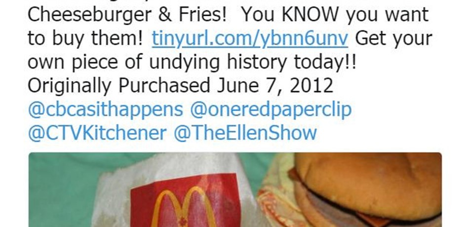 يقوم بعض الأشخاص بعرض أشياء غريبة وأحياناً سخيفة للبيع على المواقع، فمنهم من قد يعرض حذاءاً أو ساعة قديمة، إلا أن أغرب هذه الأشياء التي عُرضت ليشتريها الناس، كانت ما أقدم على فعله مزارع كندي، بعد أن عرض وجبة من الـ"برغر"، يتجاوز عمرها الست سنوات للبيع على موقع "إي باي eBay" الخاص بالبيع الإلكتروني عبر شبكة الإنترنت.