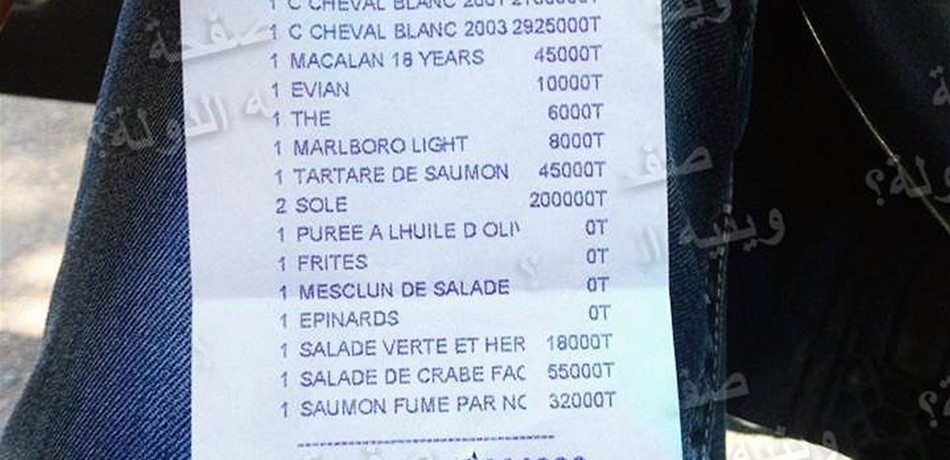 نشرت صفحة "وينيه الدولة؟"عبر موقعها الرسمي على "فايسبوك" صورة لفاتورة جديدة اثارت غضب الرأي العام، ليتبين بعد التدقيق في الطلبات أن الزبون قام بطلب زجاجتي خمر معروف انها غالية الثمن. وقالت الصفحة في تعليق لها: "أرسل لنا أحد المواطنين فاتورة صادرة عن المطعم الواقع في وسط بيروت لطاولة لشخصين والبالغة 3629$"، ونقلت الصفحة عن المواطن قوله: "إذا كانت الفاتورة الاخيرة تساوي رحلة الى تركيا فالعشاء في مطعم "..." يساوي راتب ستة أشهر للعامل في لبنان ويكفي لتقوم برحلة كاملة حول العالم". وأضاف: "ومن ثم يقولون لك "نيال يلي عندو مرقد عنزة بلبنان"...".