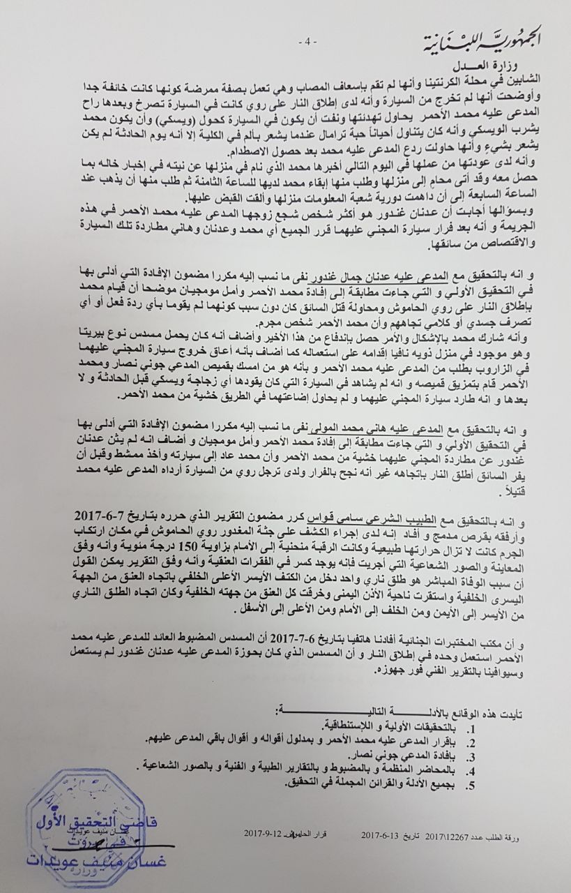 وانه بالتحقيق مع المدعي جوني جرجس نصار أفاد انه ليل 6-6-2017 كان يقود سيارته الخاصة من نوع بي ام في يرافقه فيها صديقه المغدور روي الحاموش عائدين من النادي العسكري في جونية بعد تناولهما الطعام فيه و بوصولهما إلى القرب من شركة المازدا حاول سائق سيارة من نوع بي ام في زجاجها حاجب للرؤية تجاوزه من ناحية اليمين فتوقف السير فجأة واستعمل المدعي مكابحه فانحرفت سيارته قليلا نحو اليمين مصطدمة بسيارة المدعى عليهم متسببا لها بخدش و طعج بسيطين فأوقف سيارته و إذ بالمدعى عليه عدنان جمال غندور يترجل من السيارة التي كان يقودها و ترجل منها أيضا كل من المدعى عليه محمد حسن الأحمر الذي كان يجلس خلف السائق و المدعى عليه هاني محمد المولى الذي كان يجلس في المقعد الأمامي بالقرب من السائق وقام المدعى عليه محمد حسن الأحمر بلطم وركل زجاج السيارة فيما قام المدعى عليه عدنان جمال غندور بلطم غطاء محركها بالرغم من أن المدعي و صديقه المغدور لم يتفوها بأي كلمة.