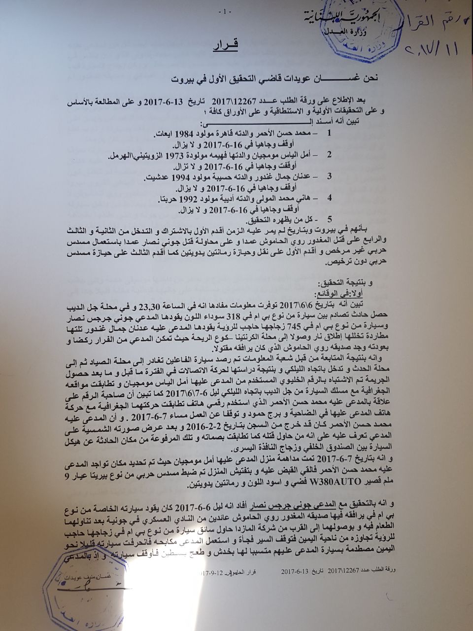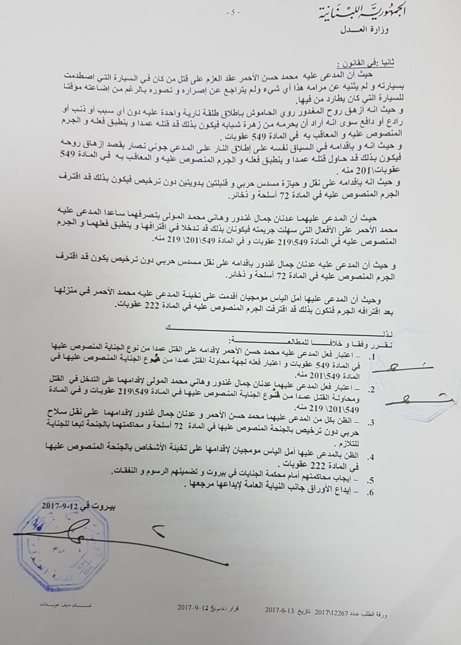 "تبين أنه بتاريخ 662017 توفرت معلومات مفادها انه في الساعة 23,30 و في محلة جل الديب حصل حادث تصادم بين سيارة من نوع بي ام في 318 سوداء اللون يقودها المدعي جوني جرجس نصار وسيارة من نوع بي ام في 745 زجاجها حاجب للرؤية يقودها المدعى عليه عدنان جمال غندور تلتها مطاردة تخللها إطلاق نار وصولا إلى محلة الكرنتينا -كوع الريحة حيث تمكن المدعي من الفرار ركضا وبعودته وجد صديقه روي الحاموش الذي كان يرافقه مقتولا.