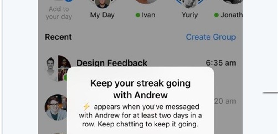 تختبر شبكة التواصل الاجتماعي "فيسبوك" ميزة جديدة بتطبيق ماسنجر تعرف بـStreak أو الأثر وهي ميزة منسوخة من تطبيق سناب شات، وهي عبارة عن رمز صغير يظهر بجوار اسم أحد الأصدقاء في تطبيق الدردشة، وقد ظهرت هذه الميزة لعدد محدود من المستخدمين، إلا أن الشركة لم تكشف عنها بشكل رسمي أو حتى تعلق عليها أيضًا. ووفقًا لما نشره موقع The Verge الأميركي، فيرى بعض الخبراء أن هذه الميزة تدفع المستخدمين لإدمان الدردشة، حيث يتوجب على المستخدم الرد على صديقه قبل أن يختفي أثره، الذي يظهر كرمز تعبيري إلى جانب اسم المستخدم لمدة معينة، أما في سناب شات فإن تلك الميزة تعد بمثابة "إثبات وجود" لهم على التطبيق. (اليوم السابع)