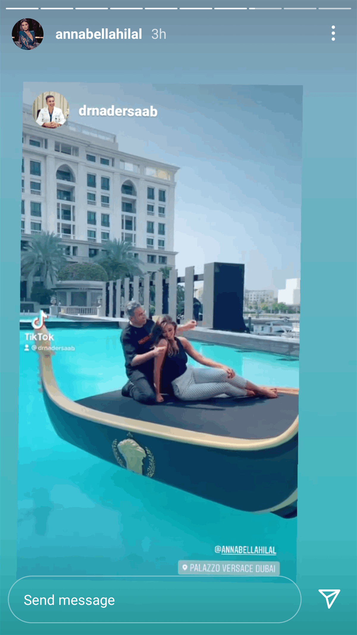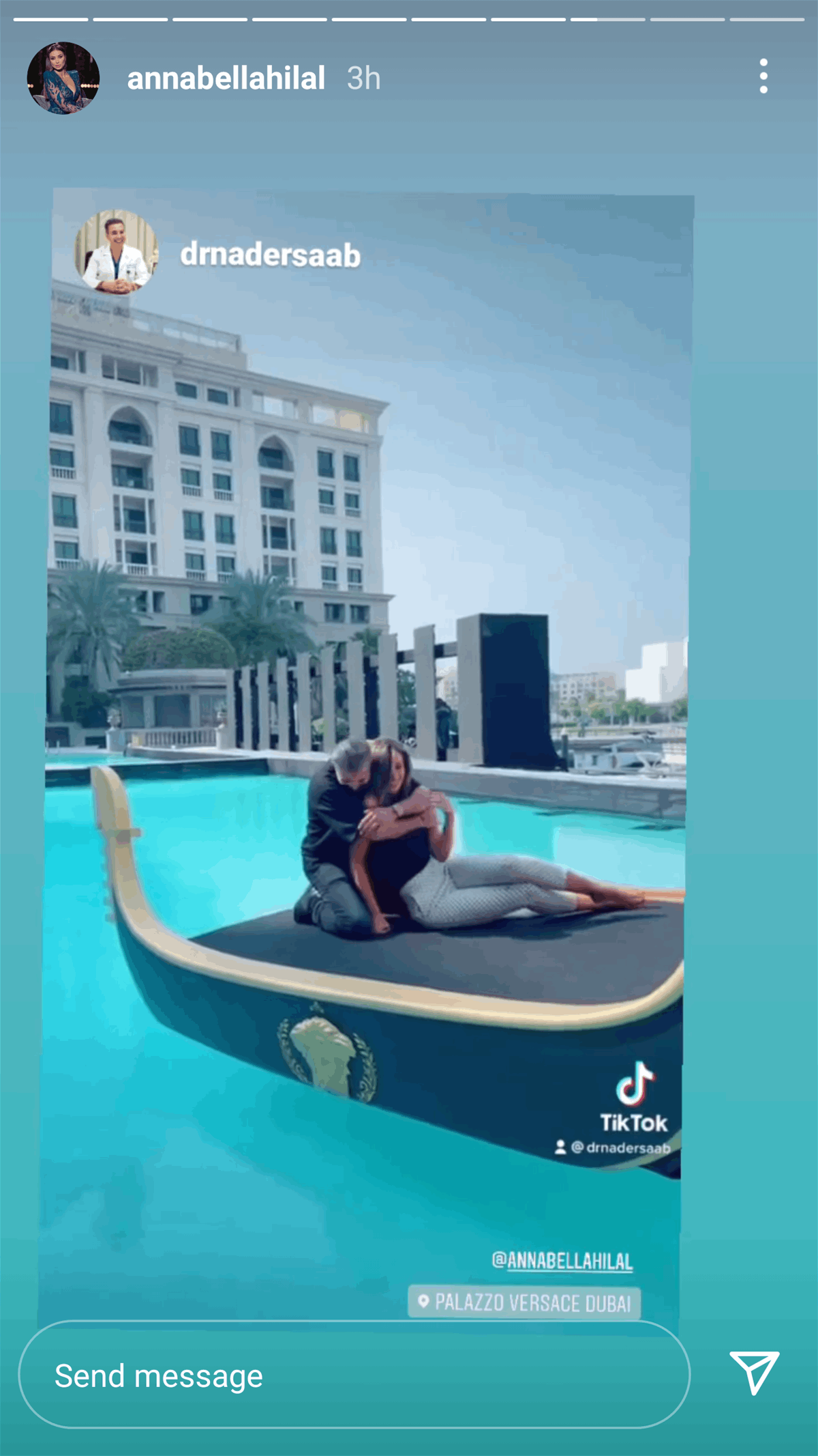 أعادت مقدّمة البرامج أنابيلا هلال نشر فيديو لزوجها نادر صعب عبر خاصيّة "ستوري" عبر حسابها على "انستغرام"، ظهرا فيه بوضعيّة رومانسيّة من داخل حوض سباحة في أحد فنادق دبي. فقد عانق نادر أنابيلا، وبدا الثنائي بغاية الفرح والانسجام. وعبّر الجمهور عن إعجابه بالفيديو، لانّ الثنائي الشهير لا يزال يعيش الحبّ كلّ لحظة.