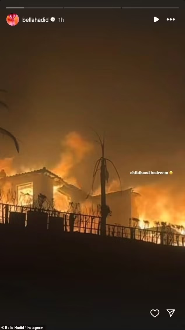 بيلا حديد عبر إنستغرام صورة مؤلمة لمنزل طفولتها في ماليبو وهو يحترق وسط سلسلة من حرائق الغابات التي اجتاحت لوس أنجلوس. الصورة التي نشرتها بيلا أظهرت الدمار الذي لحق بالمنزل، الذي كان في يوم من الأيام موطنًا لعائلة حديد، بما في ذلك بيلا وشقيقتها جيجي ووالدتهما يولاندا حديد.