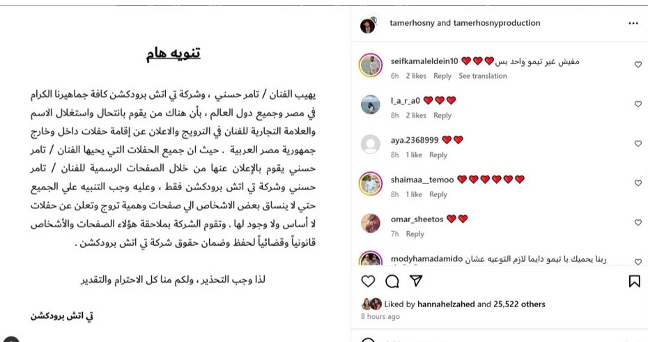 : "يهيب الفنان تامر حسني، وشركة تي إتش برودكشن بكافة جماهيرنا الكرام في مصر وجميع دول العالم، بأن هناك من ينتحل ويستغل الاسم والعلامة التجارية للفنان في الترويج والإعلان عن إقامة حفلات داخل وخارج