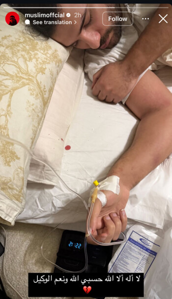 "، ظهر فيها نائماً في السرير، وعلق عليها كاتباً: "حسبي الله ونعم الوكيل".وتفاعل الجمهور مع مسلم، وتمنوا له السلامة العاجلة.