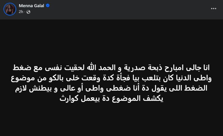 : "أنا جالي إمبارح ذبحة صدرية والحمد لله لحقت نفسي مع ضغط واطي، الدنيا كانت بتلعب بيا فجأة كده وقعت.. خلي بالكم من موضوع الضغط، اللي يقول ضغطي واطي أو عالي وبيطنش لازم يكشف.. الموضوع ده بيعمل كوارث".