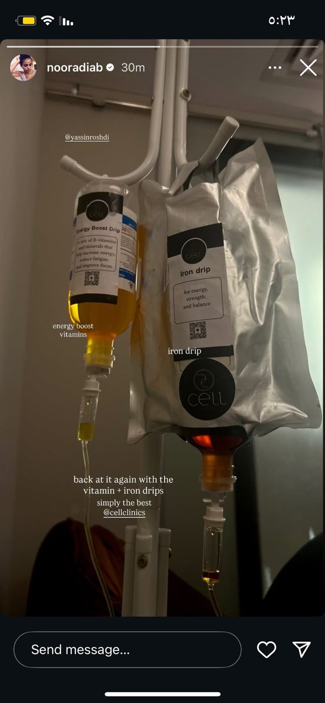 ونشرت نور صورة لها من داخل المستشفى عبر حسابها على "إنستغرام" وعلقت عليها بالقول : "العودة مرة أخرى مع قطرات الفيتامين والحديد.. الأفضل على الإطلاق."