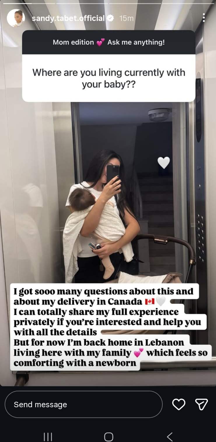 إلى أنّها استقرّت في لبنان مع عائلتها، وأوضحت أنّه مكان مُريح للعيش، لطفل حديث الولادة.