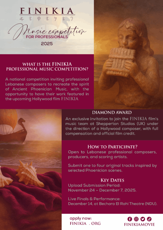 لفيلم “FINIKIA” عن إطلاق مسابقة جديدة مخصصة للموسيقيين المحترفين، بعد أسبوع تقريبًا على إطلاق مسابقة الناشئين. تهدف المسابقة إلى ابتكار مقطوعة موسيقية مستوحاة من الحضارة الفينيقية، لتصبح نواة الموسيقى التصويرية للفيلم، الذي سيُنتَج بالتعاون مع