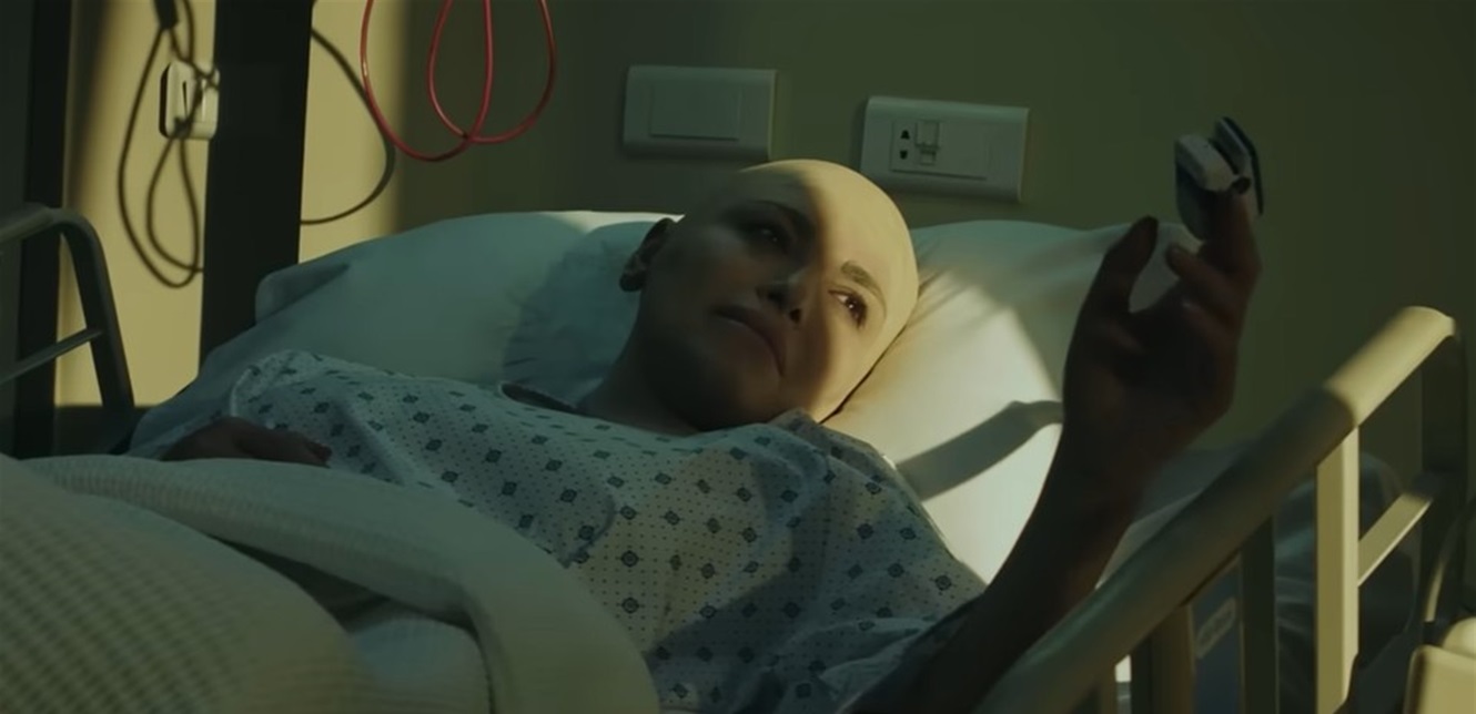 وظهرت "صلعاء" ومُتعبة وشاحبة ومن دون مكياج على سرير المرض.