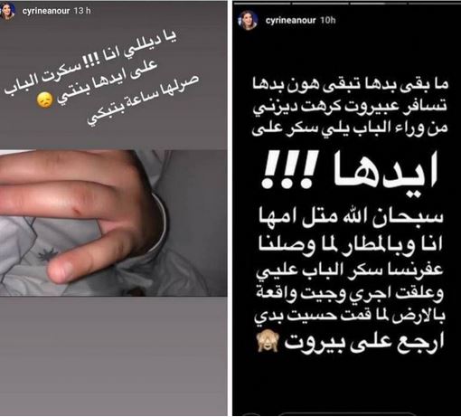 وفي الصورة التي نشرتها، ظهرت يد طفلتها المصابة وكتبت: "يا دللي أنا. سكرت الباب على إيدها بنتي. صرلها ساعة بتبكي.. ما بقى بدها تبقى هون، بدها تسافر ع بيروت. كرهت ديزني من ورا الباب لي سكر على إيدها".