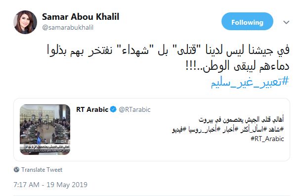 في جيشنا ليس لدينا "قتلى" بل "شهداء" نفتخر بهم بذلوا دماءهم ليبقى الوطن..!!!#تعبير_غير_سليم https://t.co/VyI1zpiDRE — Samar Abou Khalil (@samarabukhalil) May 19, 2019