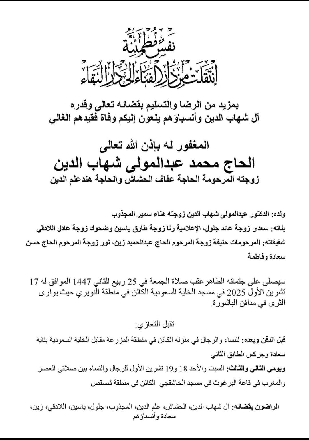 غيّب الموت الحاج محمد عبدالمولى شهاب الدين، والد رئيسة دائرة الأنباء العامة في الوكالة الوطنيّة للأنباء الزميلة رنا شهاب الدين.