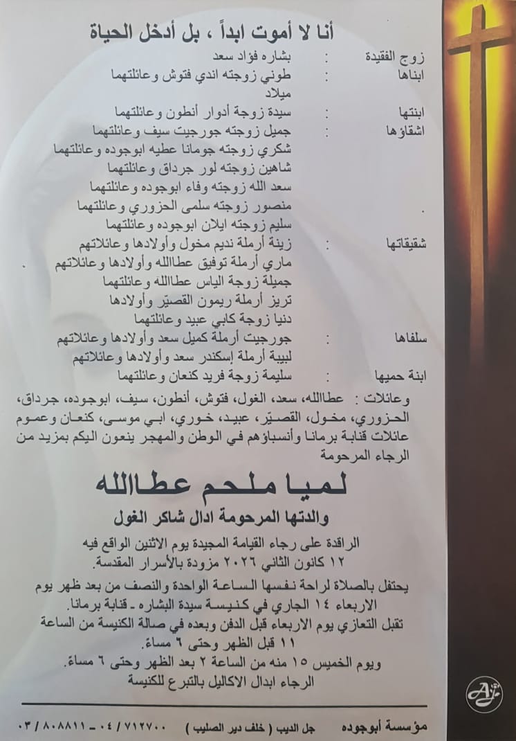 تقبل التعازي يوم الاربعاء قبل الدفن وبعده في صالة الكنيسة من الساعة 11 قبل الظهر وحتّى السادسة مساء، ويوم الخميس 15 منه، من الساعة الثانية من بعد الظهر وحتّى الساعة السادسة مساء.