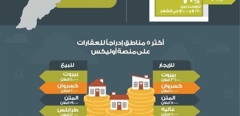 في هذا الإطار، صرّح السيّد جون نوجا، مدير عام أوليكس لبنان: "يتجه اللبنانيون نحو تفضيل شراء العقارات على استئجارها، أضف إلى ذلك، التبدّل في طبيعة طلباتهم من الشقق الواسعة إلى الشقق المتوسطة والصغيرة، بعبارة أخرى، فقد فضلوا الأسعار المعقولة على المساحات الكبيرة. في العام 2017، تراوحت إيجارات 70% من العقارات على أوليكس بين 250 و1000 دولار أمريكي شهرياً، وأسعار بيع 84% من العقارات بين 25,000 و300,000 دولارأمريكي".
