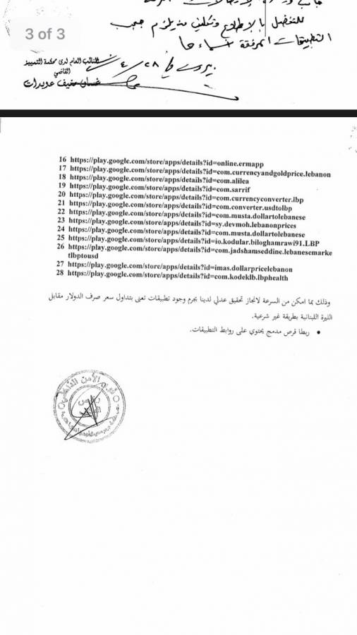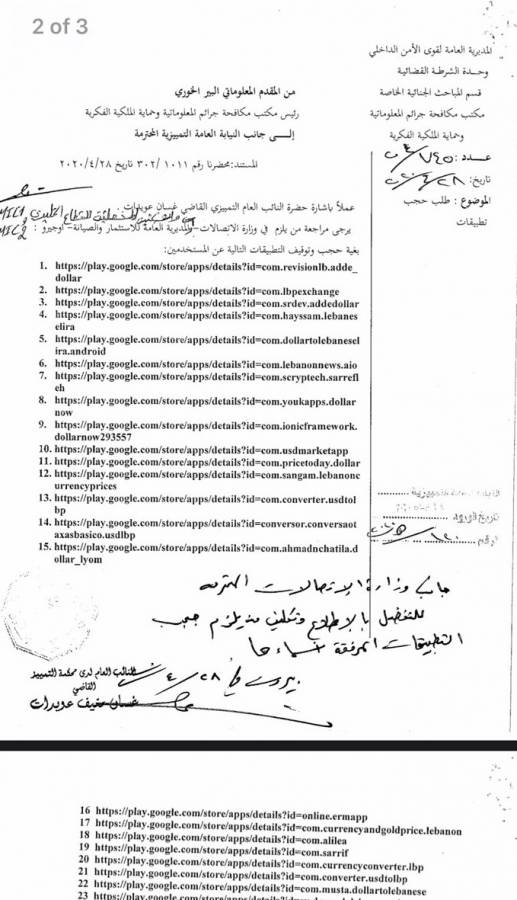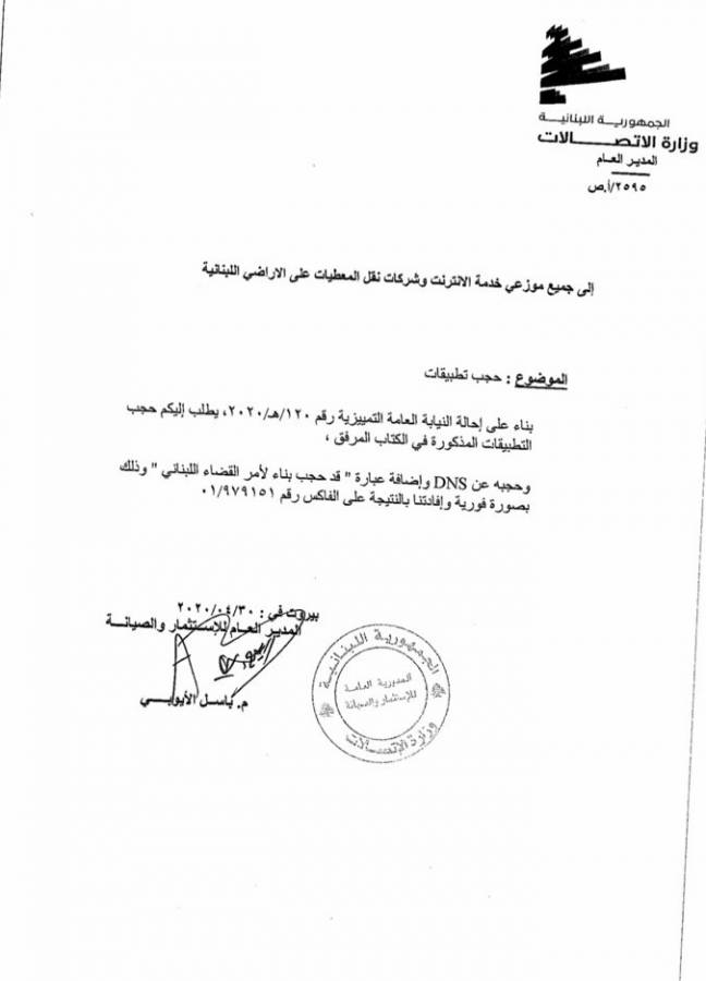 و بناء على إحالة النيابة العامة التمييزية، طلب المدير العام للاستثمار والصيانة في وزارة الاتصالات، باسيل الأيوبي، إلى جميع موزعي خدمة الانترنت وشركات نقل المعطيات على الأراضي اللبنانية، حجب التطبيقات الـ28 المذكورة في الكتاب المرفق المتعلقة بسعر صرف الدولار، وحجبه عن DNS، وإضافة عبارة "قد حجب بناء لأمر القضاء اللبناني".