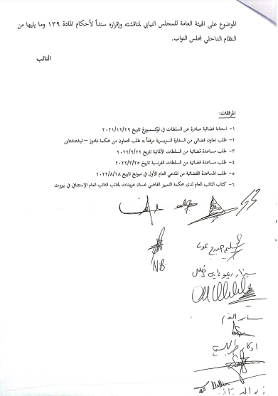 والنواب الموقعون على الاقتراح هم: سيزار ابي خليل، سامر التوم، فريد البستاني، سليم عون، شربل مارون، ادكار طرابلسي، ندى البستاني،