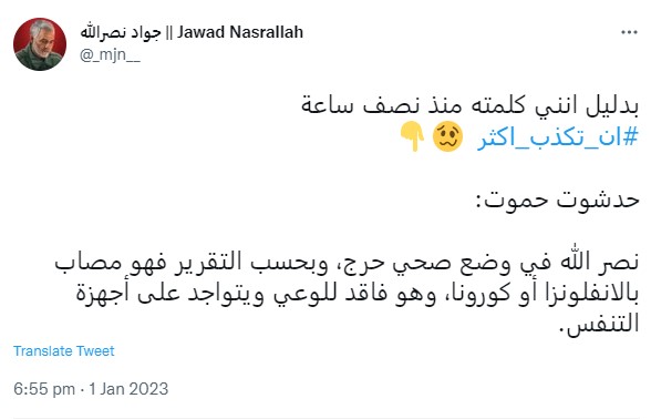 عن ان "نصرالله في وضع صحي حرج، وان بحسب التقرير فهو مصاب بالانفلونزا أو