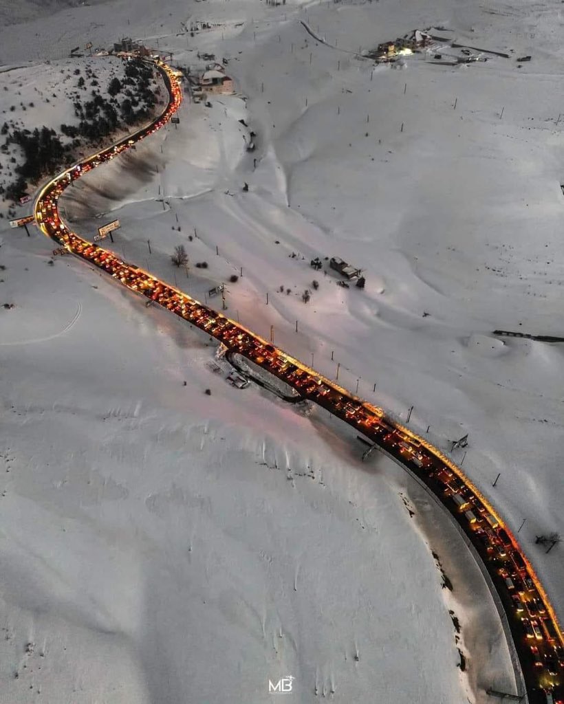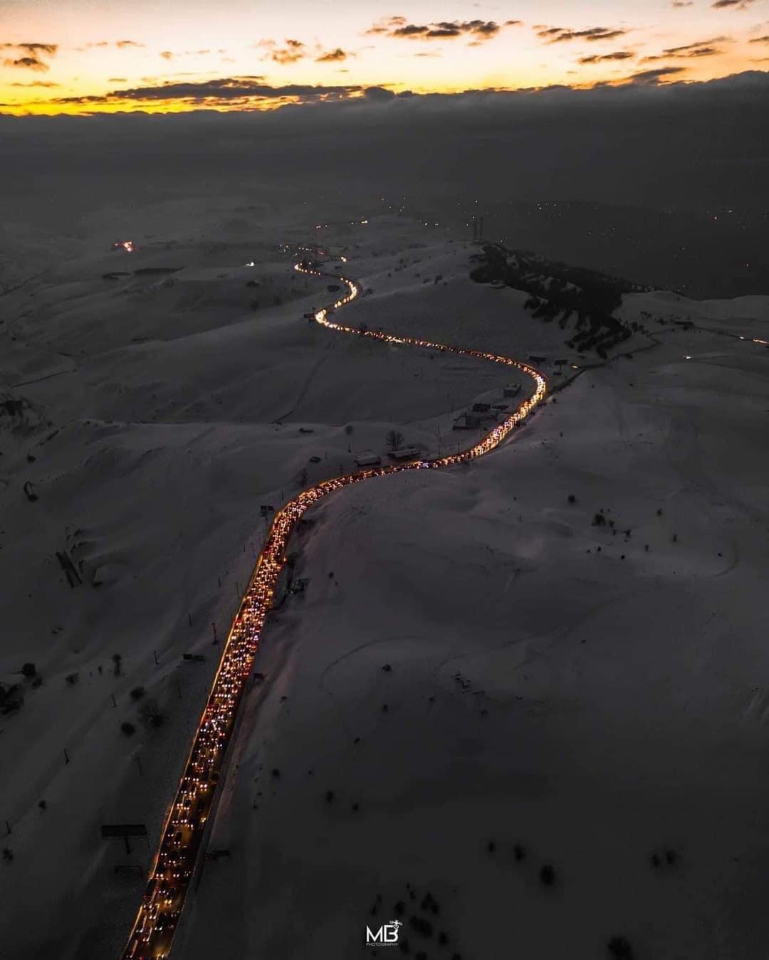 انتشرت يوم أمس، صورٌ جوية تظهرُ قافلة كبيرة من السيارات على