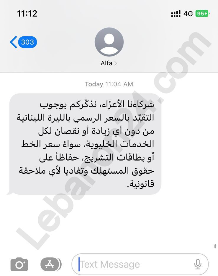" أنّ شركة "ألفا" حذّرت الوكلاء المعتمدين والموزعين ومحال البيع التي تتعامل مباشرة معها، من مغبّة مُخالفة السعر الرسمي بالليرة