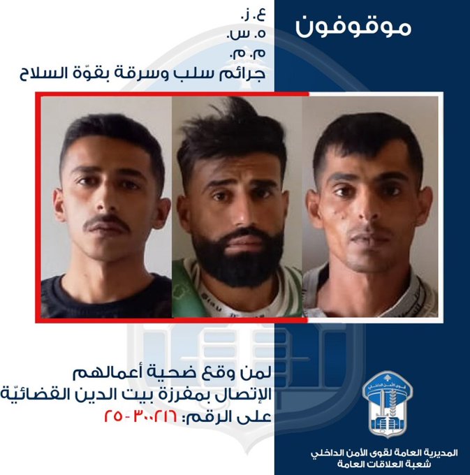 المختص، تُعمّم المديريّة العامّة لقوى الأمن الداخلي صورة الموقوفين، وتطلب من الذين وقعوا ضحيّة أعمالهم، الاتّصال بمفرزة بيت الدين القضائية، على أحد الرقمين: 300216-25 أو 300187-25، تمهيدًا لاتّخاذ الإجراءات القانونية اللّازمة.
