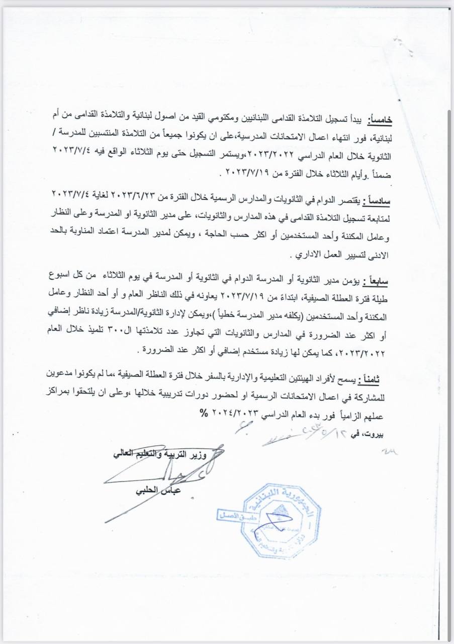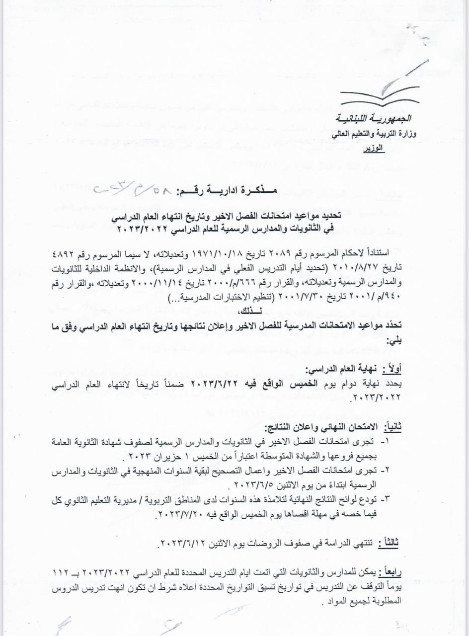 وأعلن أنّ يوم الخميس الواقع في 22-6-2023، هو تاريخ إنتهاء العام الدراسيّ 2022 - 2023.