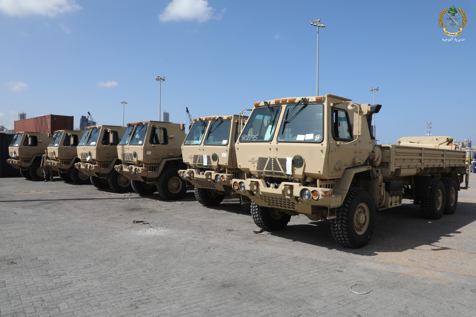 باخرة محملة بخمس عشرة شاحنة عسكرية من ضمن برنامج الهبات الأميركية المخصصة للجيش اللبناني".