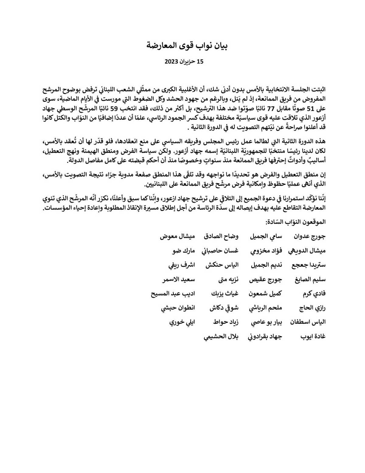 الانتخابية بالأمس اثبتت بدون أدنى شك، أن الغالبية الكبرى من ممثّلي الشعب اللبناني ترفض بوضوح المرشح المفروض من فريق الممانعة، إذ لم يَنل، وبالرغم من جهود الحشد وكل الضغوط التي مورست في الأيام الماضية، سوى 51 صوتًا مقابل 77 نائبًا صوّتوا ضد هذا الترشيح، بل أكثر من ذلك، فقد انتخب 59 نائبًا المرشّح الوسطي جهاد أزعور الذي تلاقت عليه قوى سياسيّة مختلفة بهدف كسر الجمود الرئاسي، علمًا أن عددًا إضافيًا من النوّاب والكتل كانوا قد أعلنوا صراحةً عن نيّتهم التصويت له في
