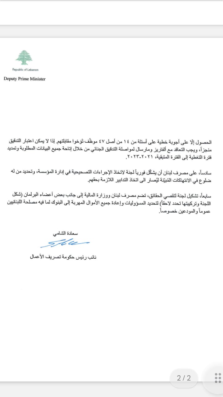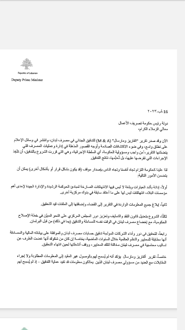 كتاباً الى الحكومة بشأن رأيه بالاجراءات الحكومية الواجب اتخاذها بعد تقرير "ألفاريز ومارسال".