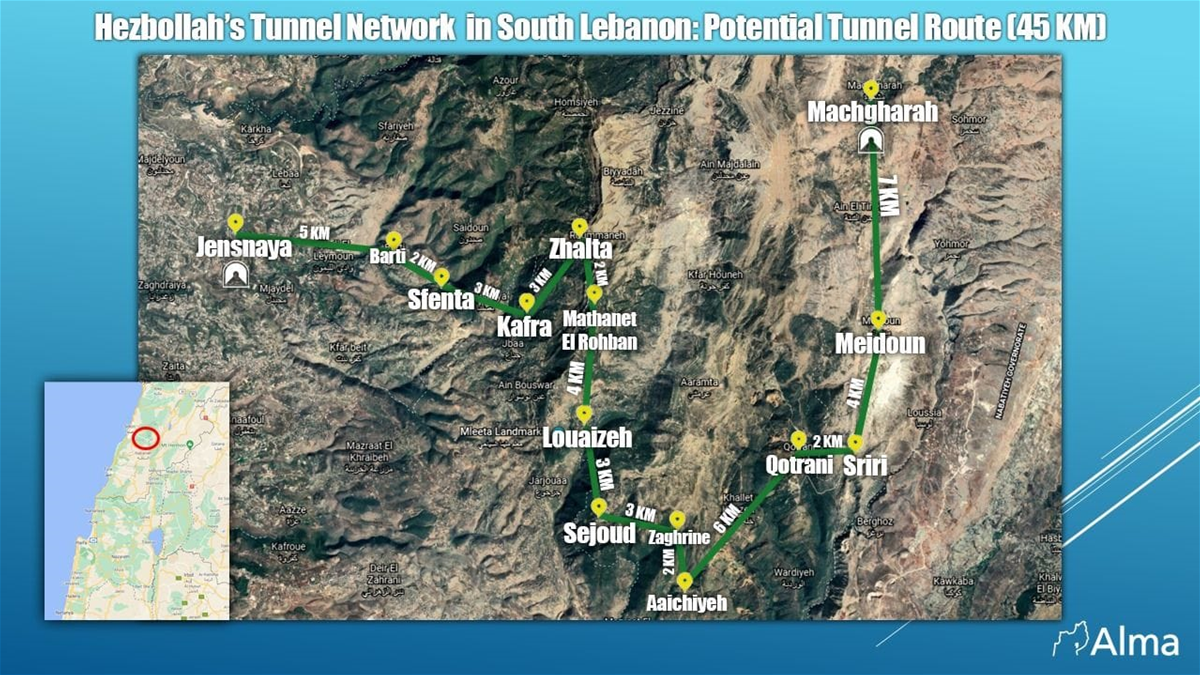 ونشر المعهد الإسرائيلي خريطة تُظهر مسار نفق يمتلكه "حزب الله" ويبدأ من منطقة جنسنايا - قضاء جزين وصولاً إلى بلدة مشغرة في