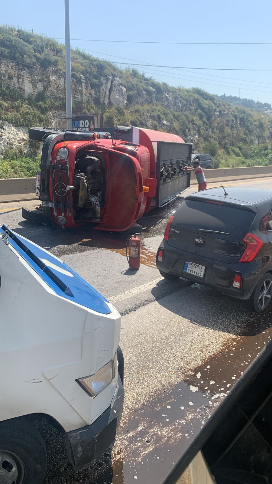 انقلاب شاحنة يتسبب بتسرب محروقات وقطع طريق في صيدا
