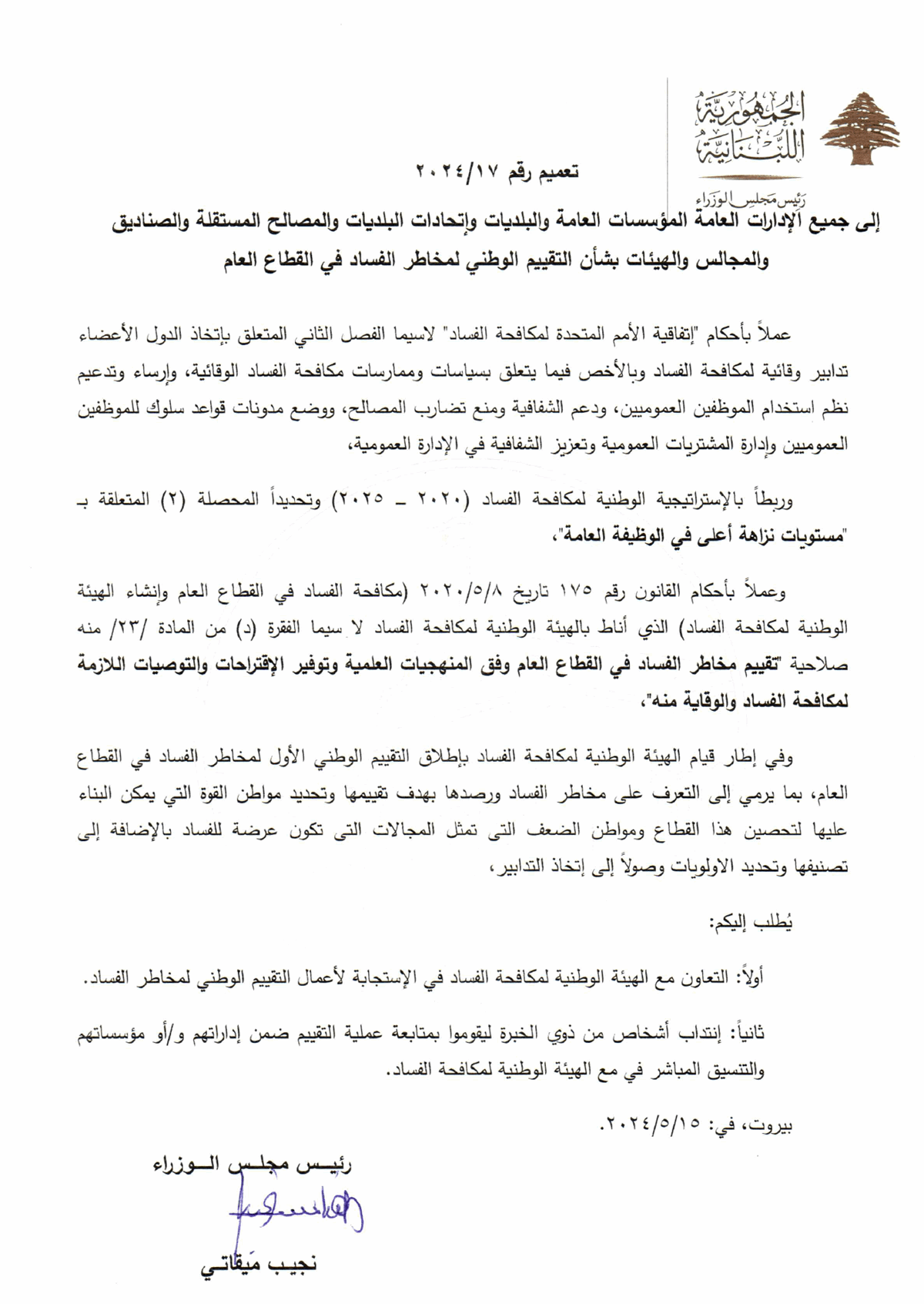 والمؤسسات العامة والبلديات واتحادات البلديات والمصالح المستقلة والصناديق والمجالس والهيئات بشأن التقييم الوطني لمخاطر الفساد في القطاع العام.