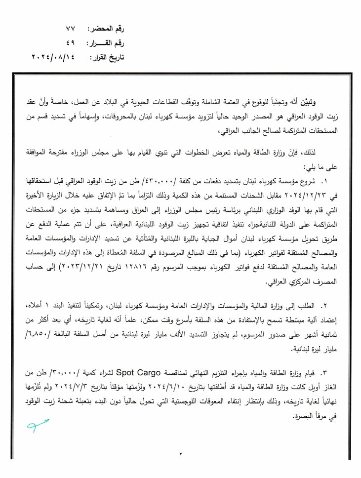 هل وافقت الحكومة على تأمين حاجة مستحقات "كهرباء لبنان" من المحروقات؟
