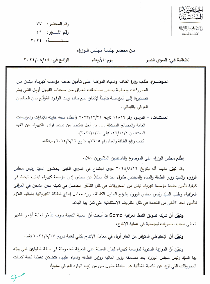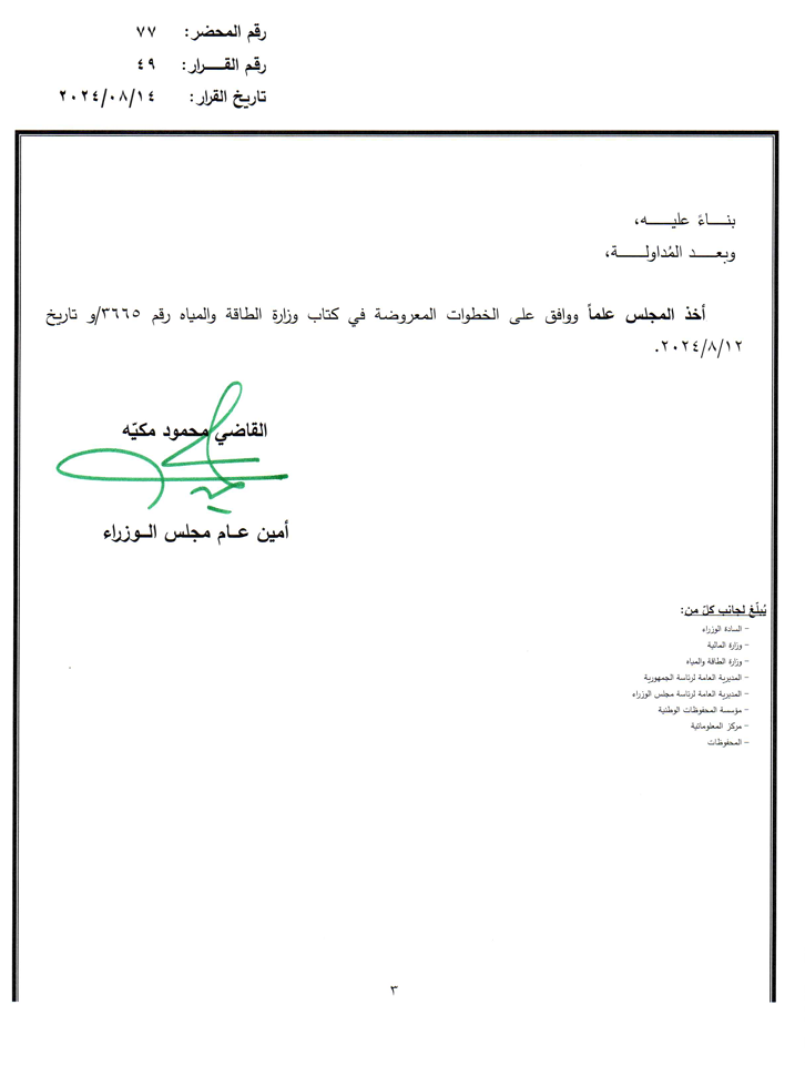 ووافق المجلي على الخطوات المعروضة في كتاب وزارة الطاقة والمياه رقم 3665/و وتاريخ 12-8-2024.