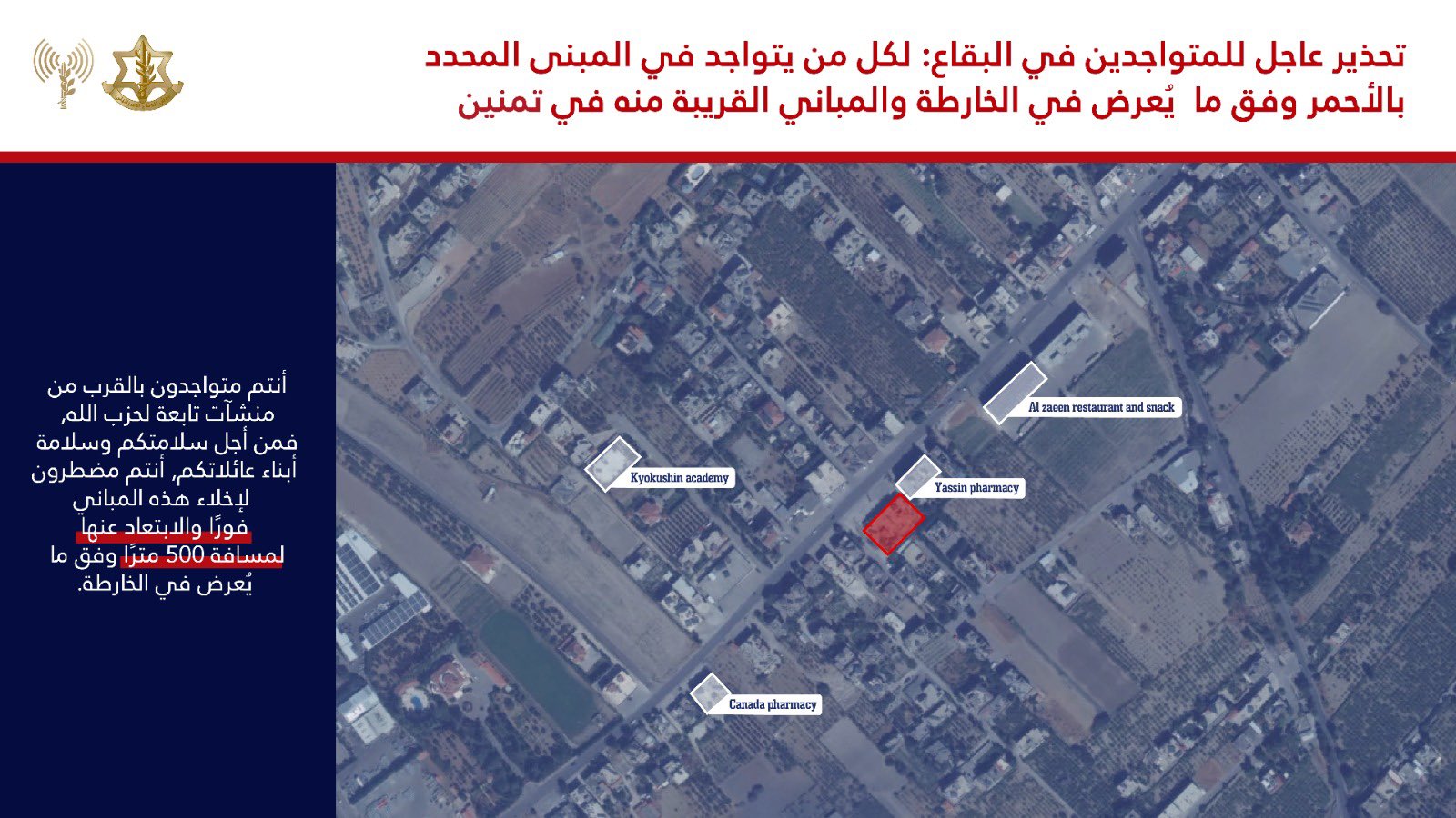 وتحديدًا المتواجدين في المبنى المحدد في الخارطة والواقع في منطقة تمنين.. أنتم متواجدون بالقرب من منشآت ومصالح تابعة لحزب الله حيث سيعمل ضدها الجيش على مدى