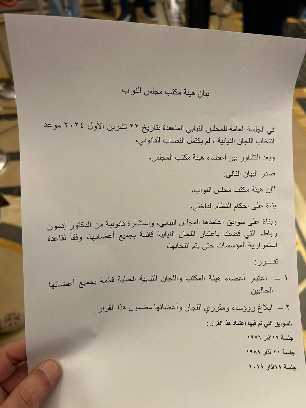 بيان، جاء فيه أنّه تقرّر إعتبار هيئة المكتب واللجان النيابية الحالية قائمة بجميع أعضائها الحاليين.
