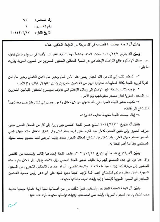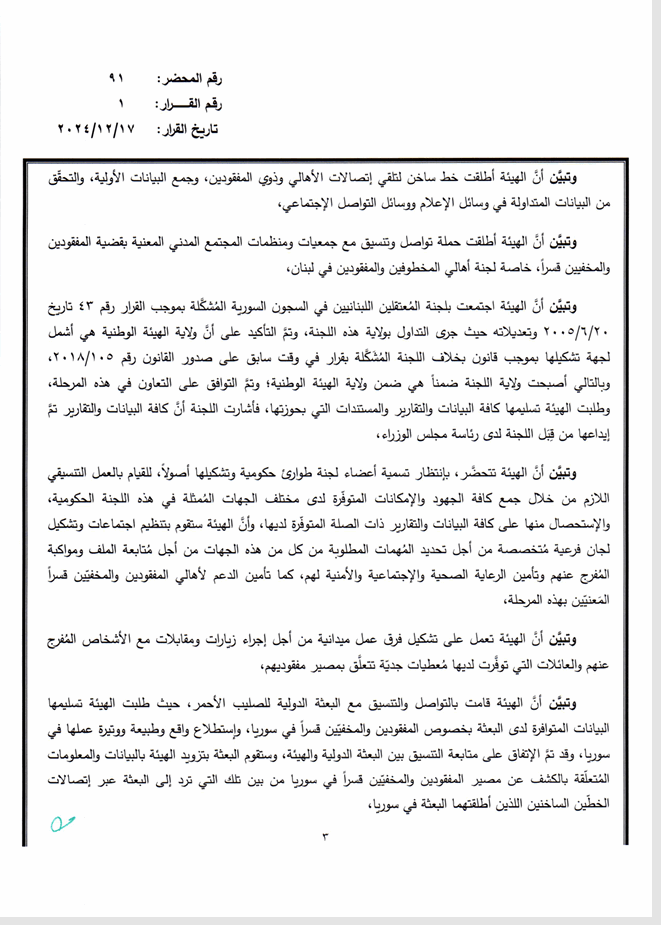 اليوم، عُرض تقريران للهيئة الوطنية للمفقودين والمخفيين قسراً وللجنة معالجة قضية اللبنانيين المعتقلين في