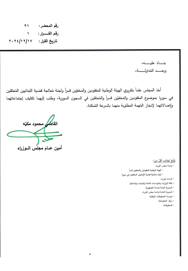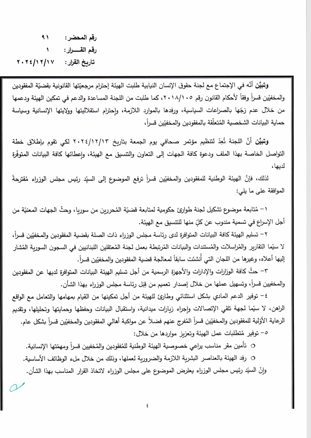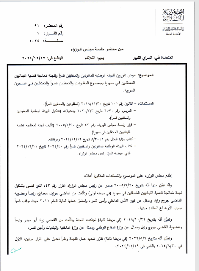 ماذا قرر مجلس الوزراء بشأن قضية المفقودين والمعتقلين في السجون السورية؟