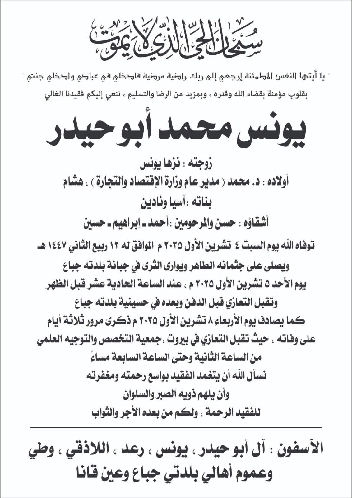 يُصادف يوم الأربعاء في 8 تشرين الأول ذكرى مرور ثلاثة أيام على وفاته، وتقبل التعازي في جمعية التخصص والتوجيه العلمي - الجناح -