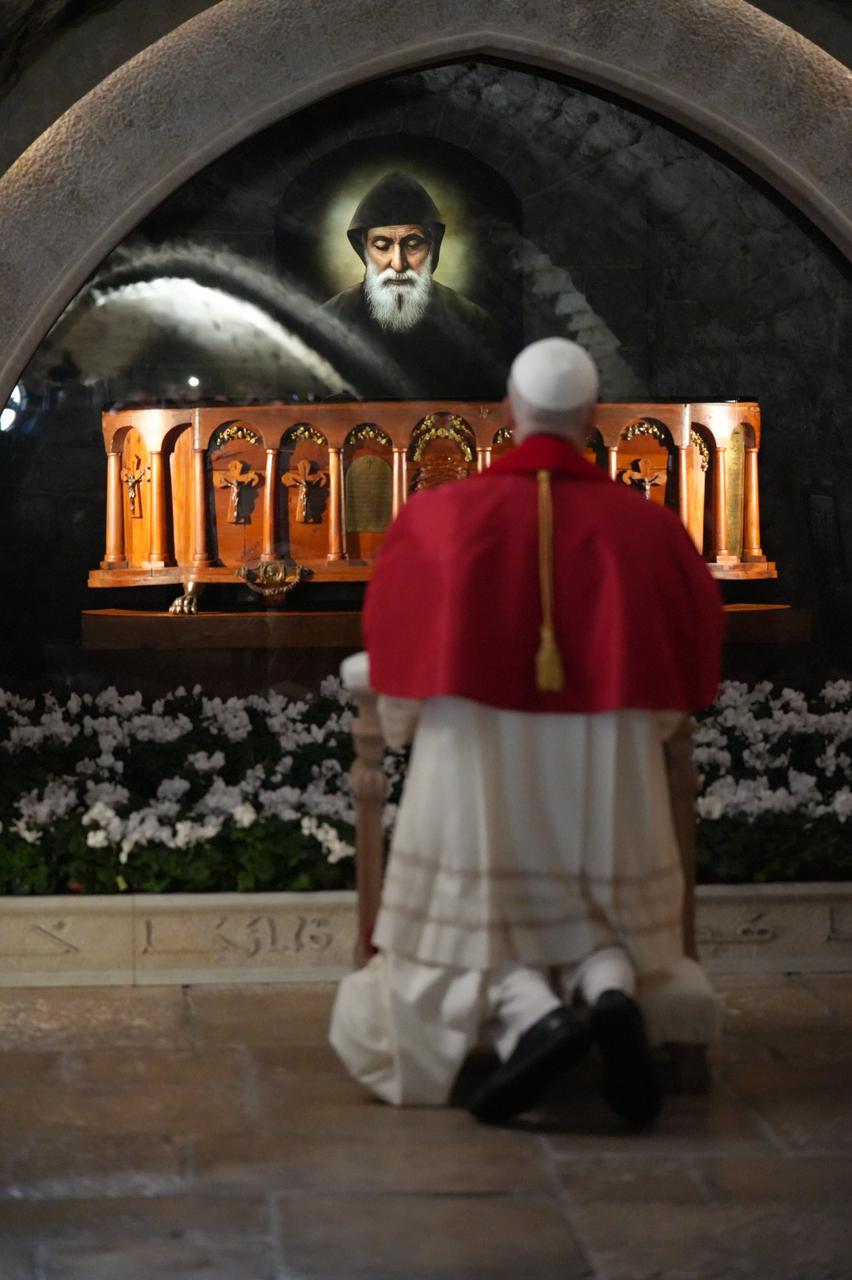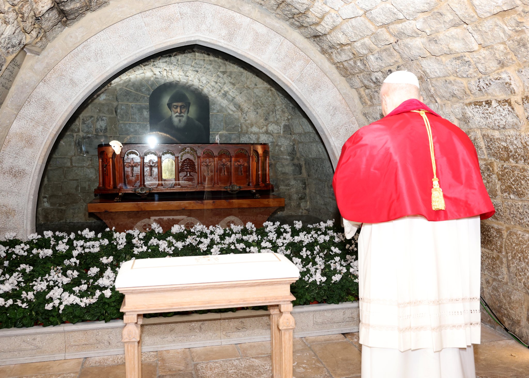 وفي مشهد مليء بالقداسة، جثا البابا لاوون على ركبتيه ليصلي امام ضريح القديس شربل فور وصوله.