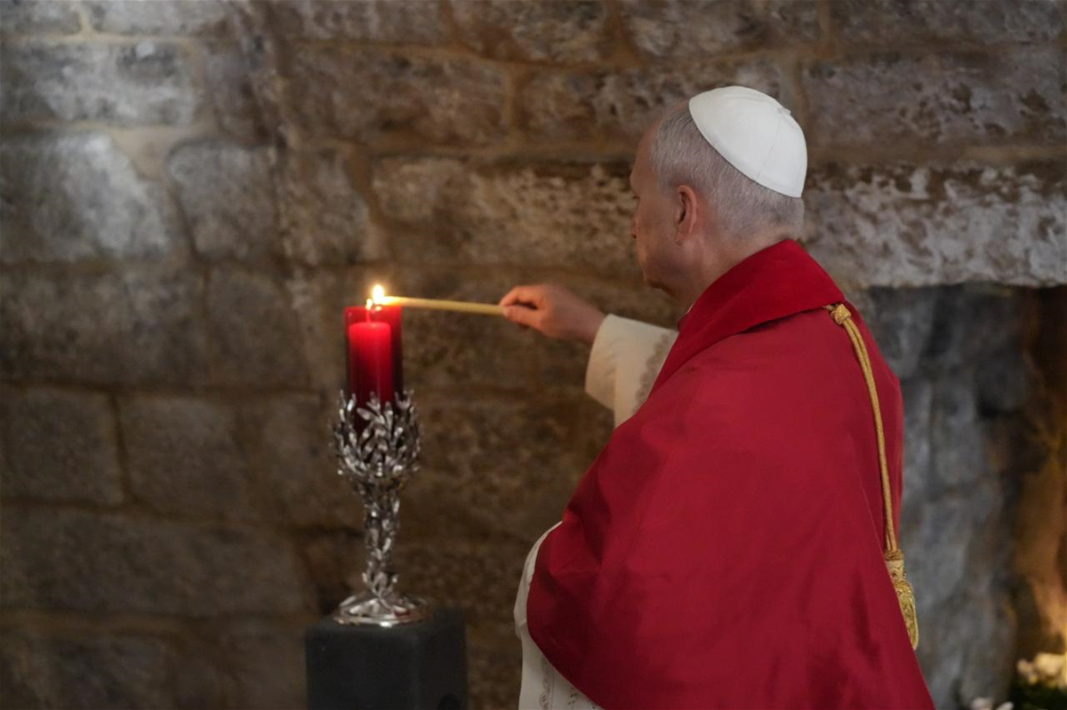 وعند وصوله، حيّا البابا المؤمنين المتجمعين في المزار، وجال بينهم مباركًا ومصافحًا الحاضرين.