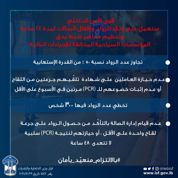 أعلنت المديرية العامة لقوى الامن الداخلي عبر "تويتر"، أنّها "ستعمل على إخلاء الرواد وإقفال الصالات لمدة 24 ساعة وتنظيم محاضر ضبط بحق المؤسسات السياحية المخالفة للإجراءات الوقائية".