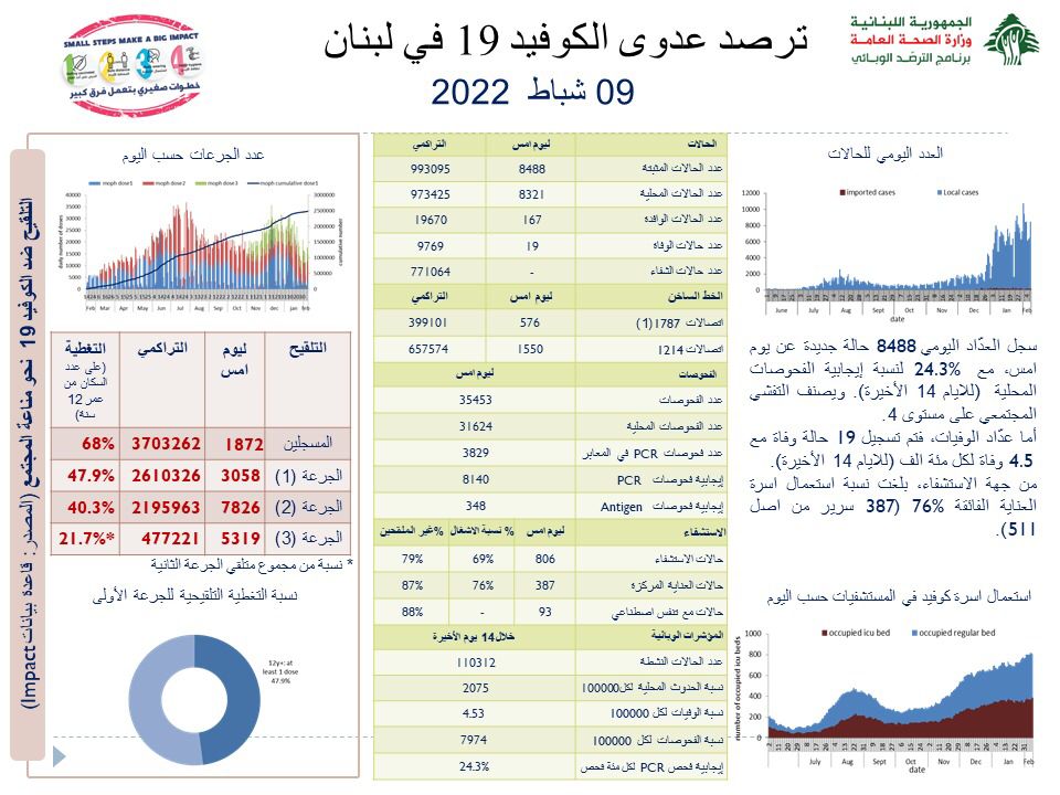 كما وسجل لبنان 19 حالة وفاة ما رفع العدد التراكمي للوفيات إلى 9769.